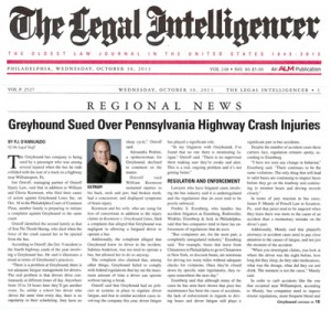 Jon Ostroff was featured in the The Legal Intelligencer’s October 2013 Article, ‘Greyhound Sued Over Pennsylvania Highway Crash Injuries’. Below are excerpts from this article.